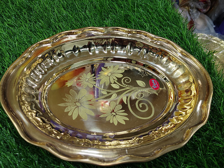 An oval designer brass plate, perfect as a return gift for weddings, parties, or festive occasions. Its elegant shape and fine finish add a touch of style and tradition, making it a beautiful gift for your guests.