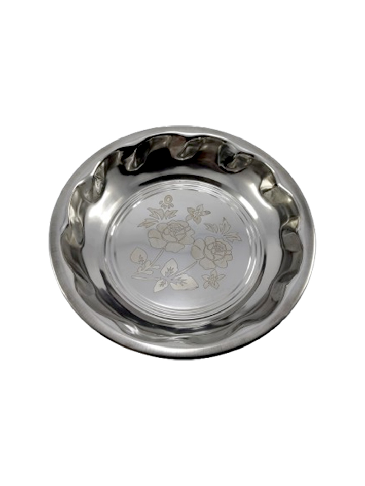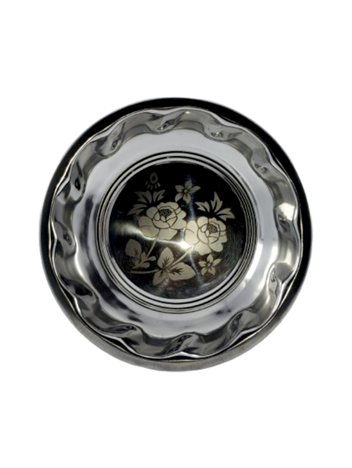 & Free ShippingA stainless steel plate with scalloped edges and floral center design.