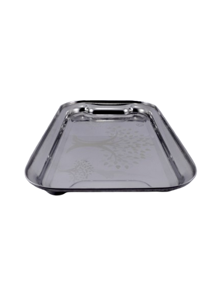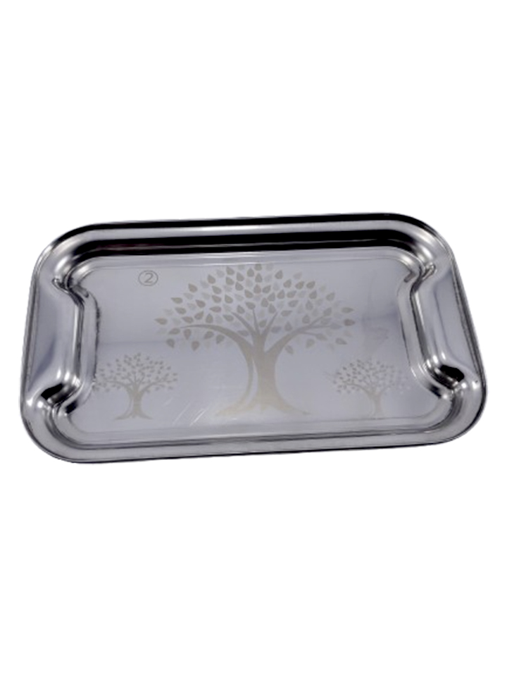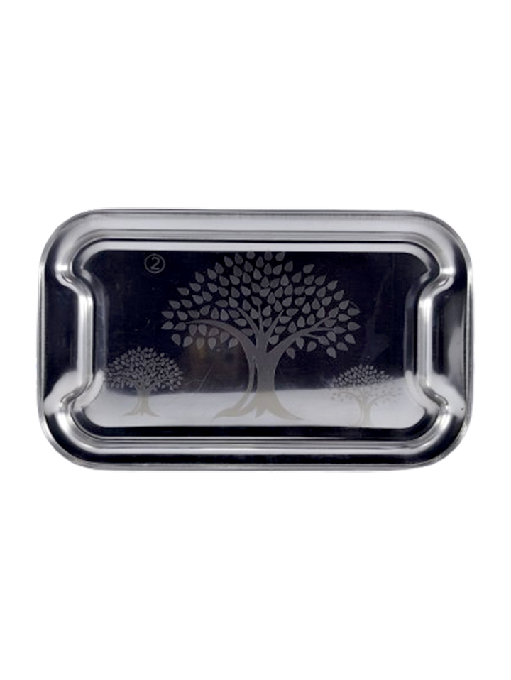 & Free ShippingA rectangular stainless steel tray with engraved tree artwork.