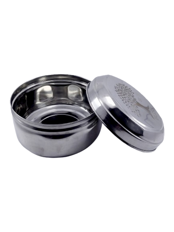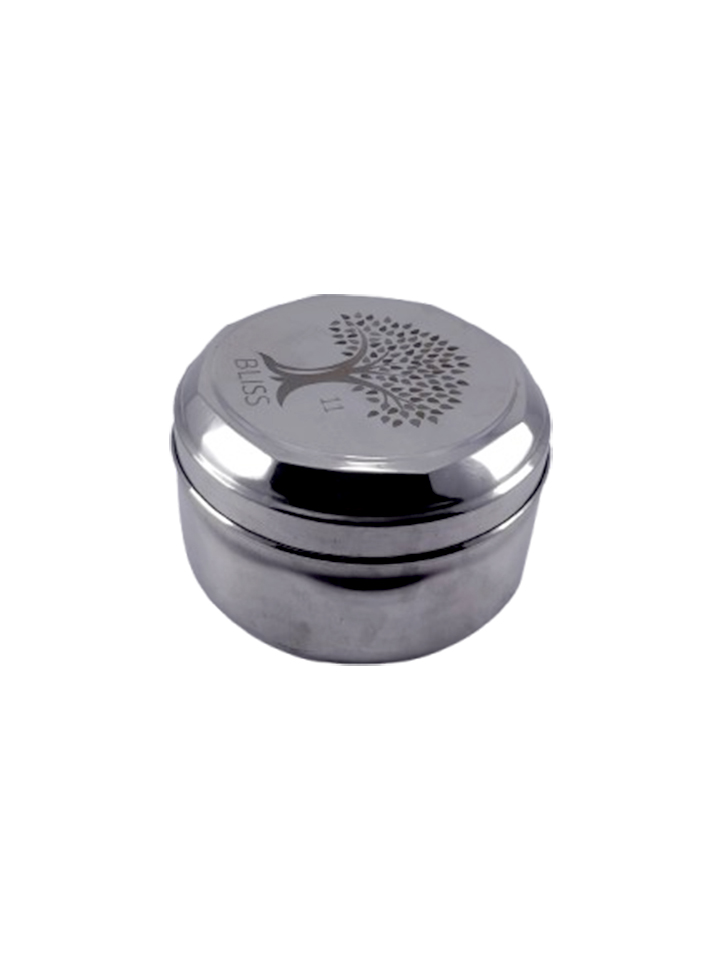 & Free ShippingA round stainless steel box with a decorative tree-engraved lid.