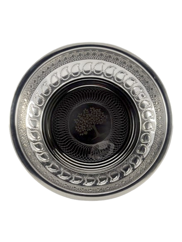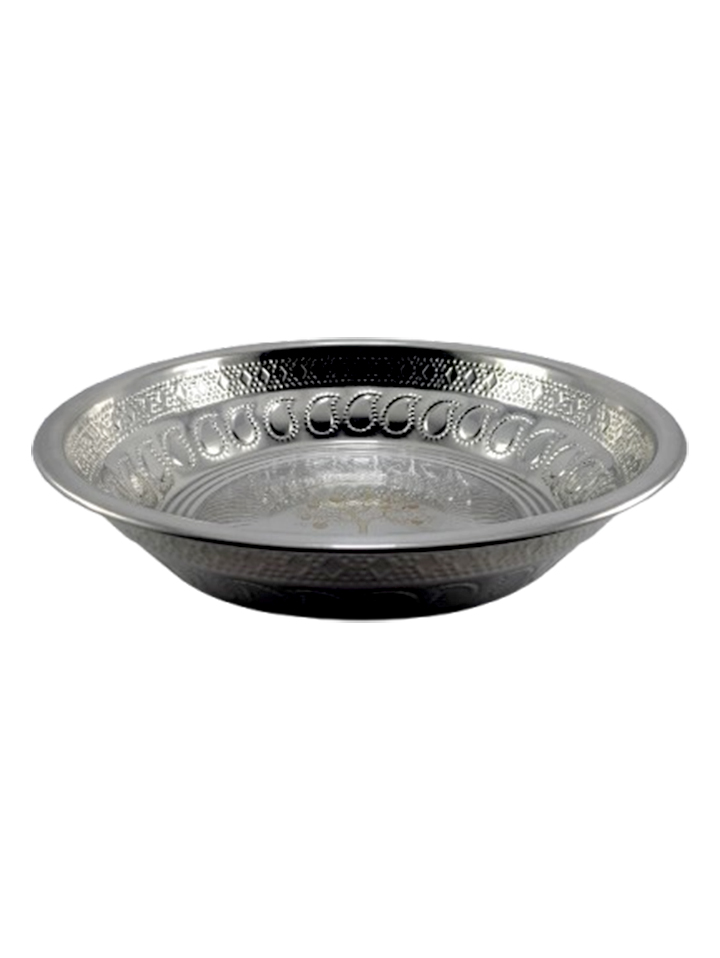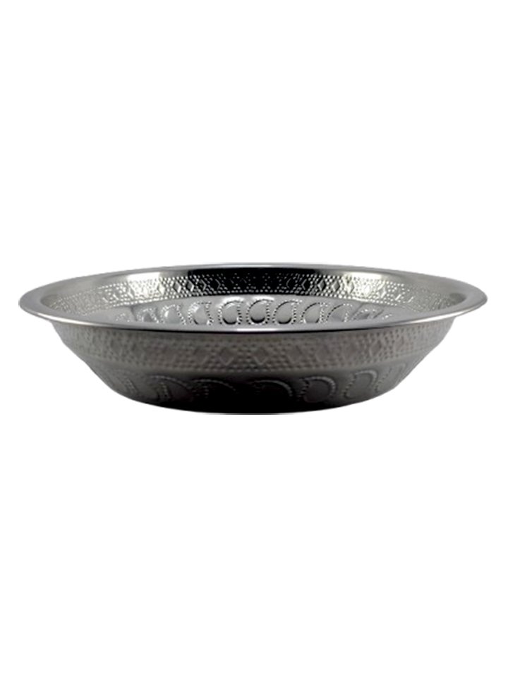 A deep stainless steel plate with a decorative rim design.