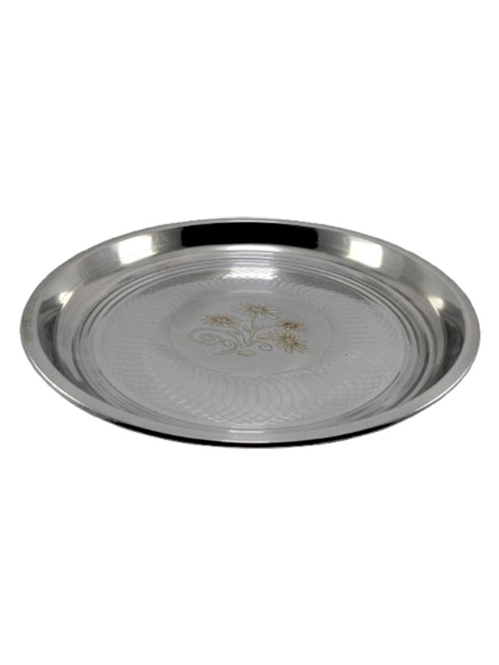& Free ShippingA clean stainless steel plate with light floral engraving.